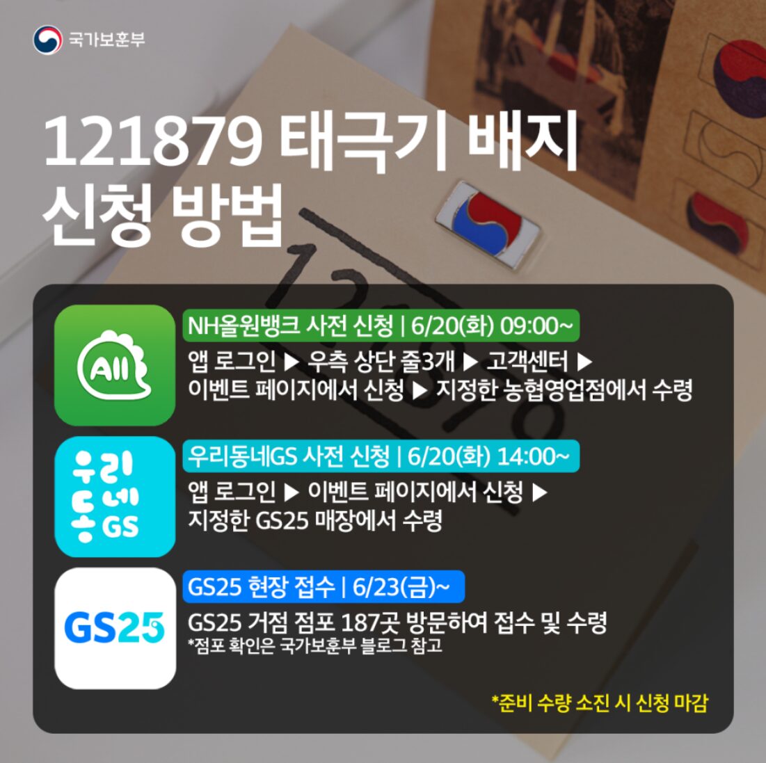 신청은 NH농협 앱과, GS마트앱, GS25에서 현장접수 가능하며 상세 방법은 다음과같다.